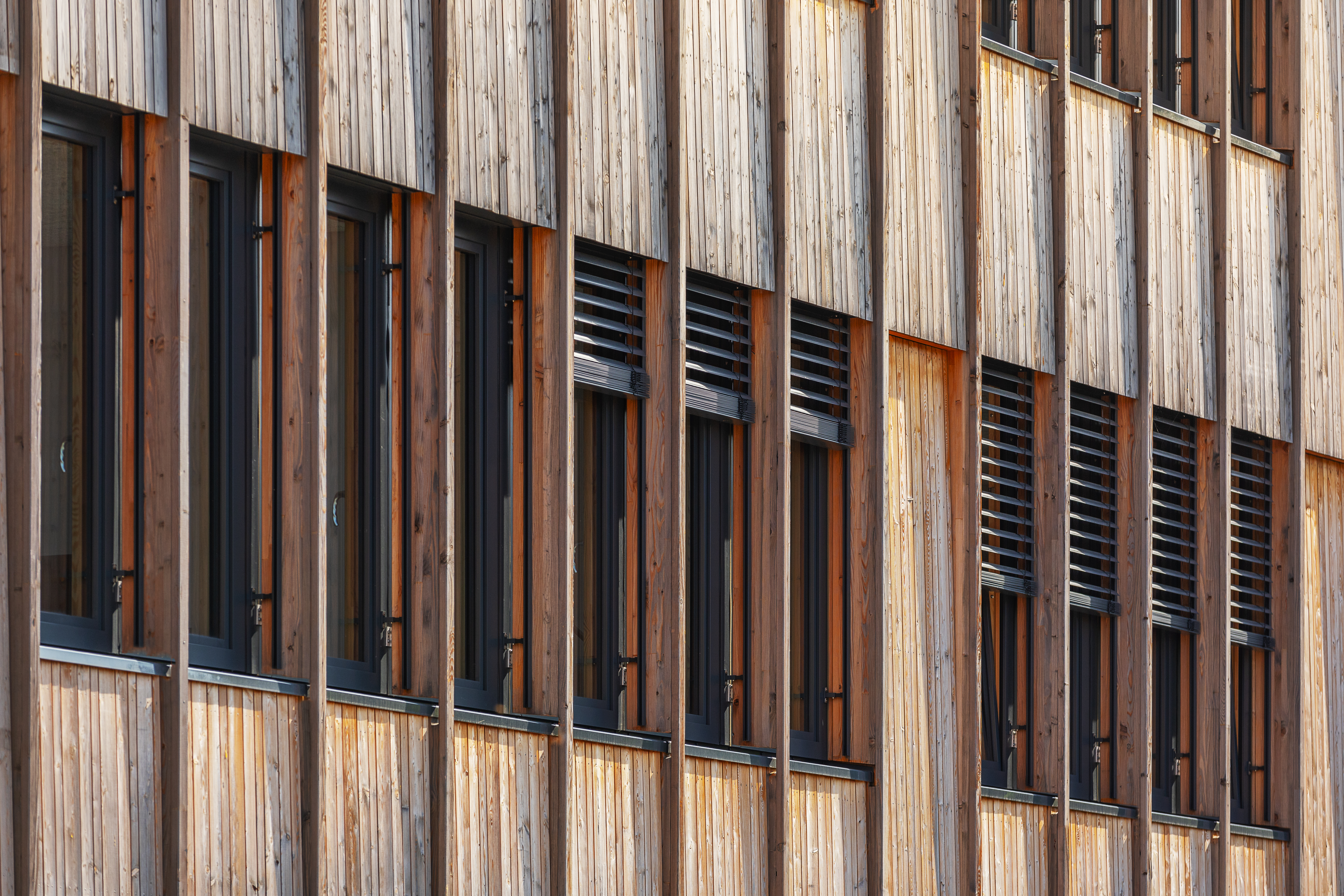 With the exception of the foundation, the building is designed with circularity in mind. Special attention has been given to ensure that the materials used can be seamlessly and harmlessly separated during remodeling or deconstruction. This approach allows for the return of building materials and components back into the material cycle or for reuse. The wooden facade's design breaks down the building's substantial volume and aligns it with the adjacent residential structures. The interior spaces are illuminated through an inner courtyard. The basement of the building is adapted to the site's topography and seamlessly integrates with the terrain, minimizing the need for extensive earthworks.